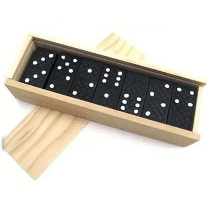Lauamäng 2-6 inimesele, komplektis 28 musta doominoklotsi (1,8 x 3,6 cm) puidust karbis (5 x 15 cm). Hea väike karbike reisikotti pistmiseks!