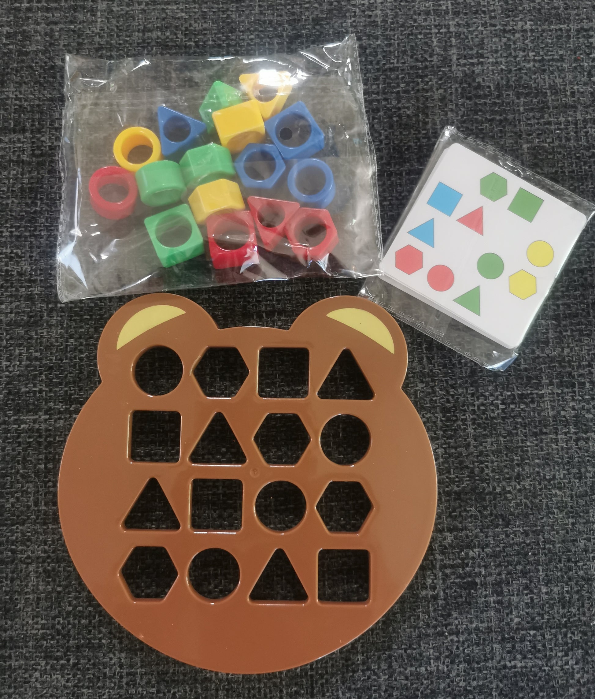 Mäng koosneb neljast erineva kujuga klotsidest (4 erinevat värvi), mida laps alusele paigutada saab. Kaasas on 15 erineva värvikombinatsiooniga kaarti.