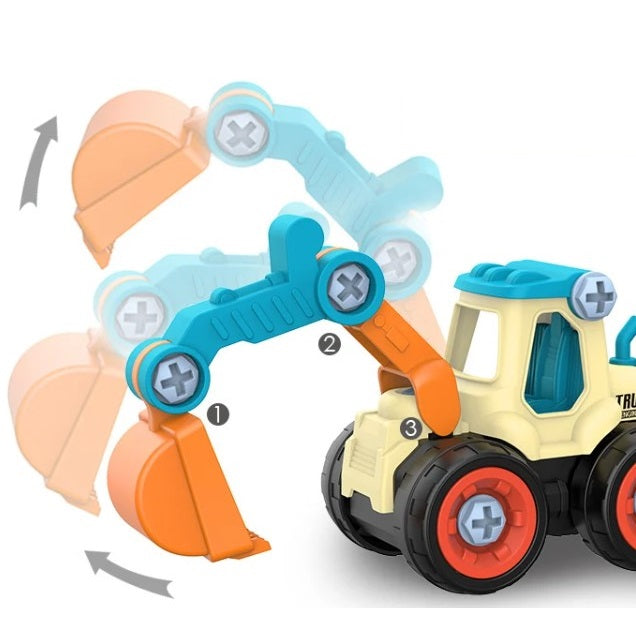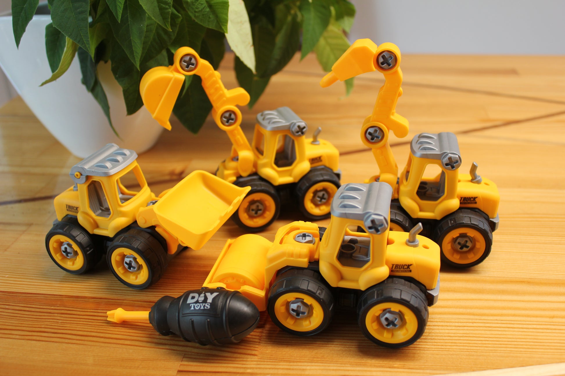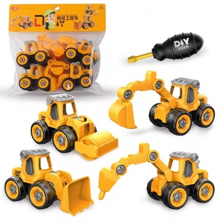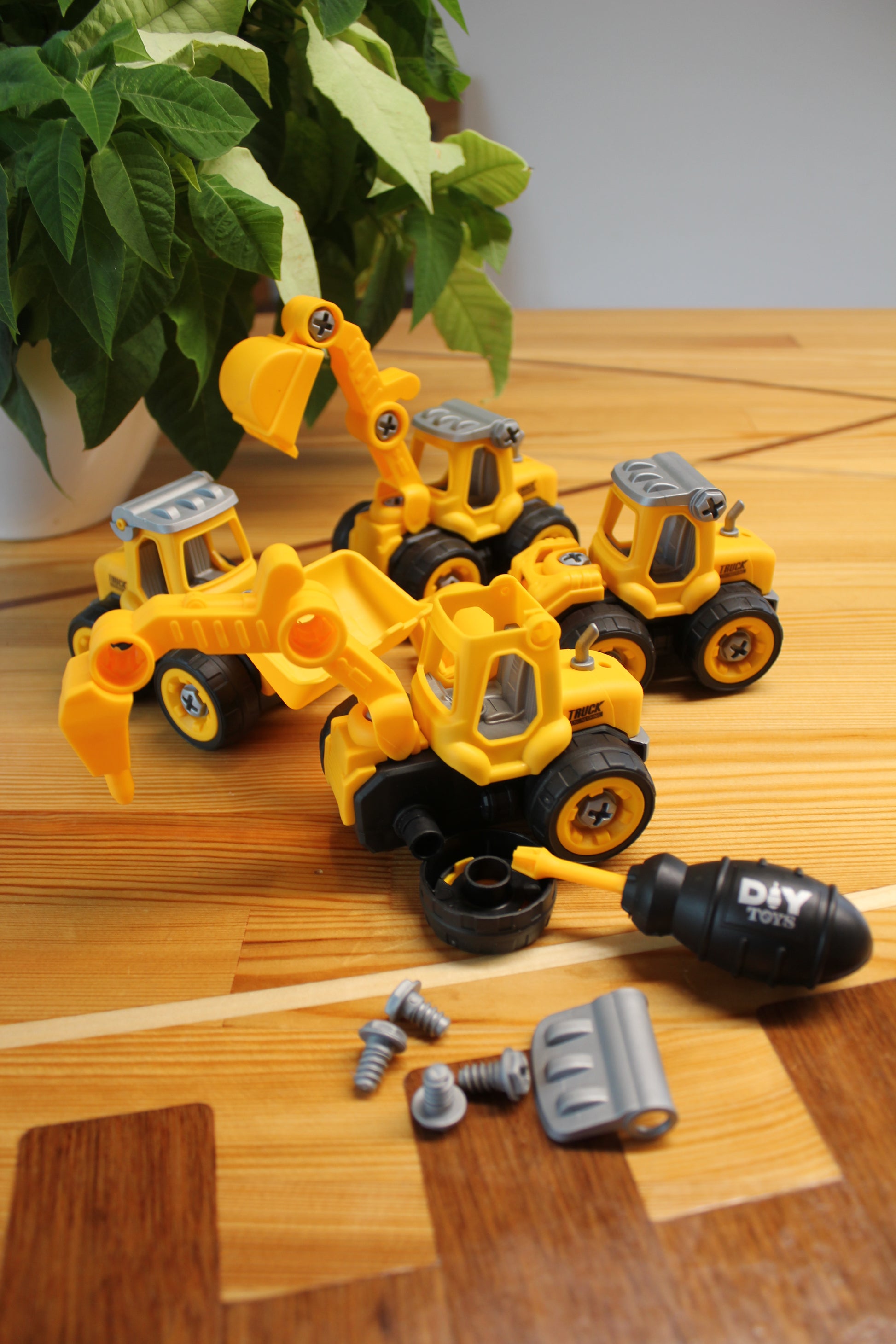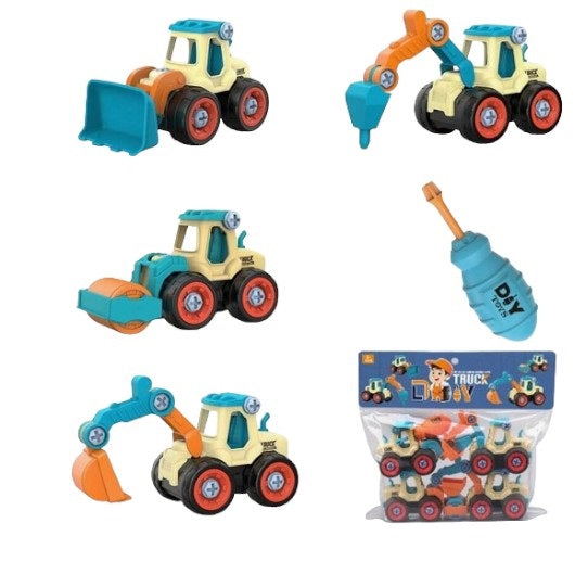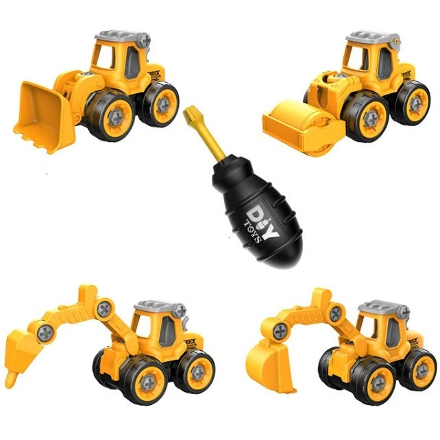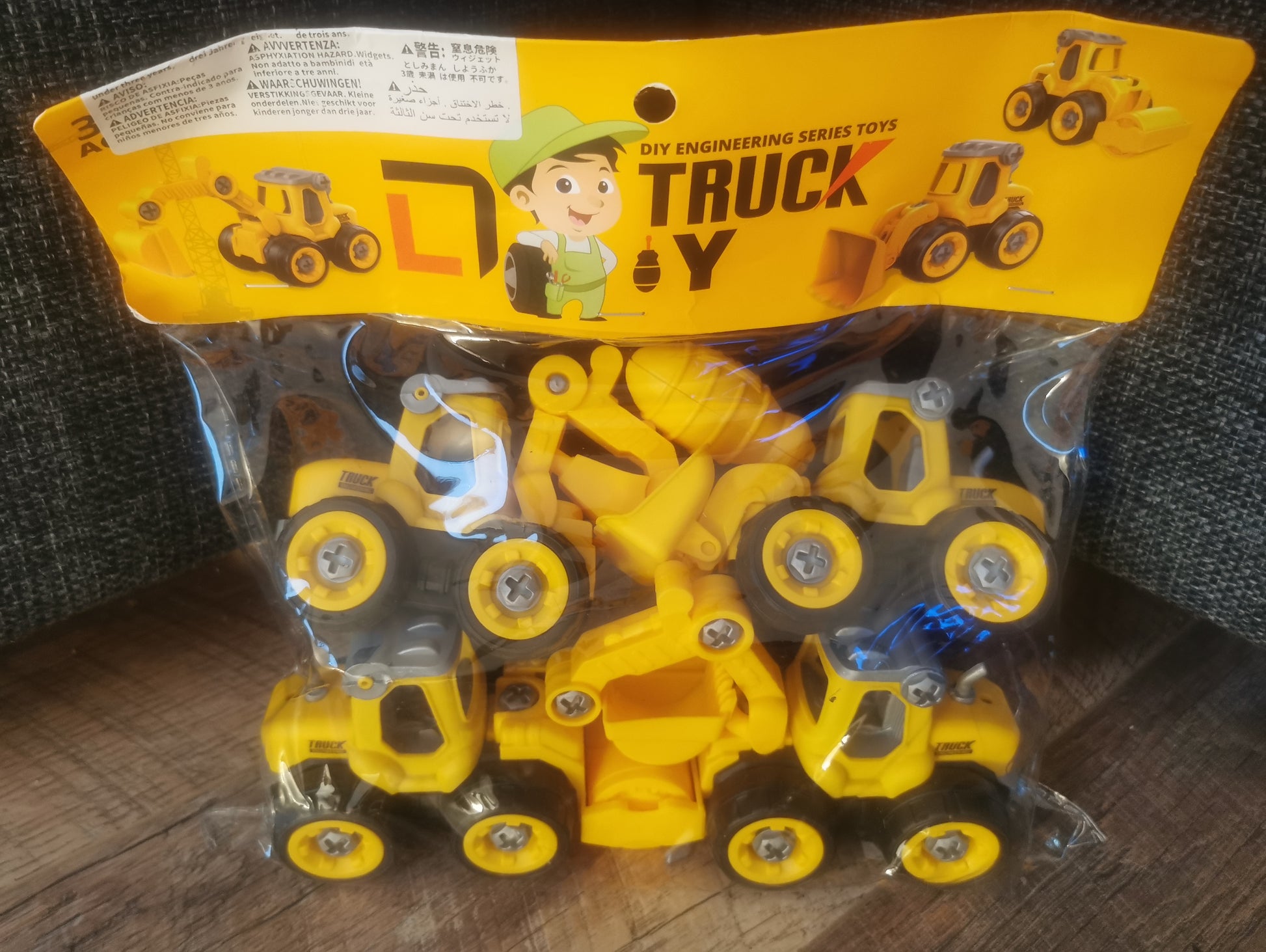 Komplektis on 4 erinevat masinat - buldooser, teerull, ekskavaator, traktori ees olev puur ja kruvikeeraja.