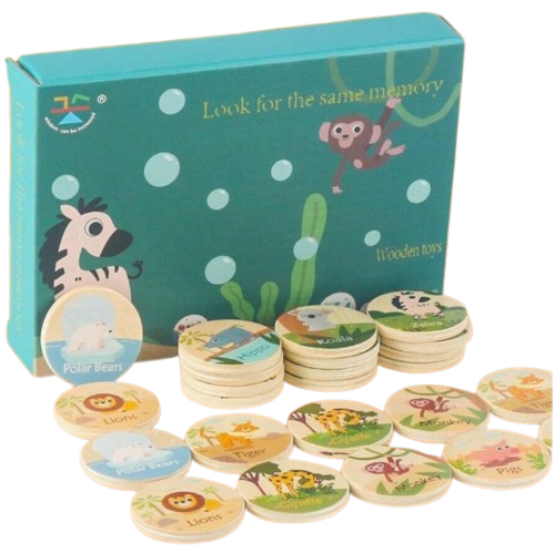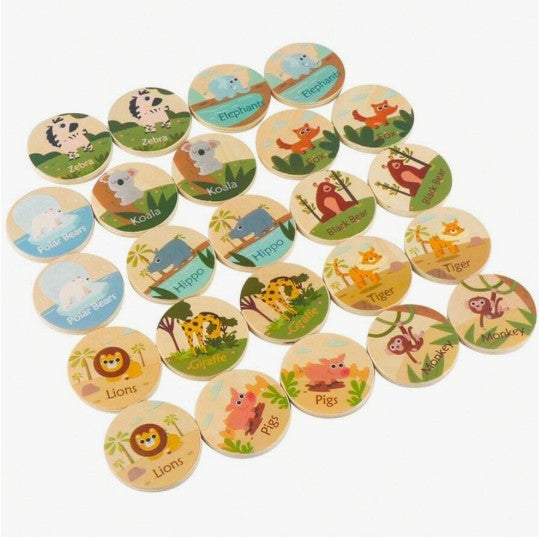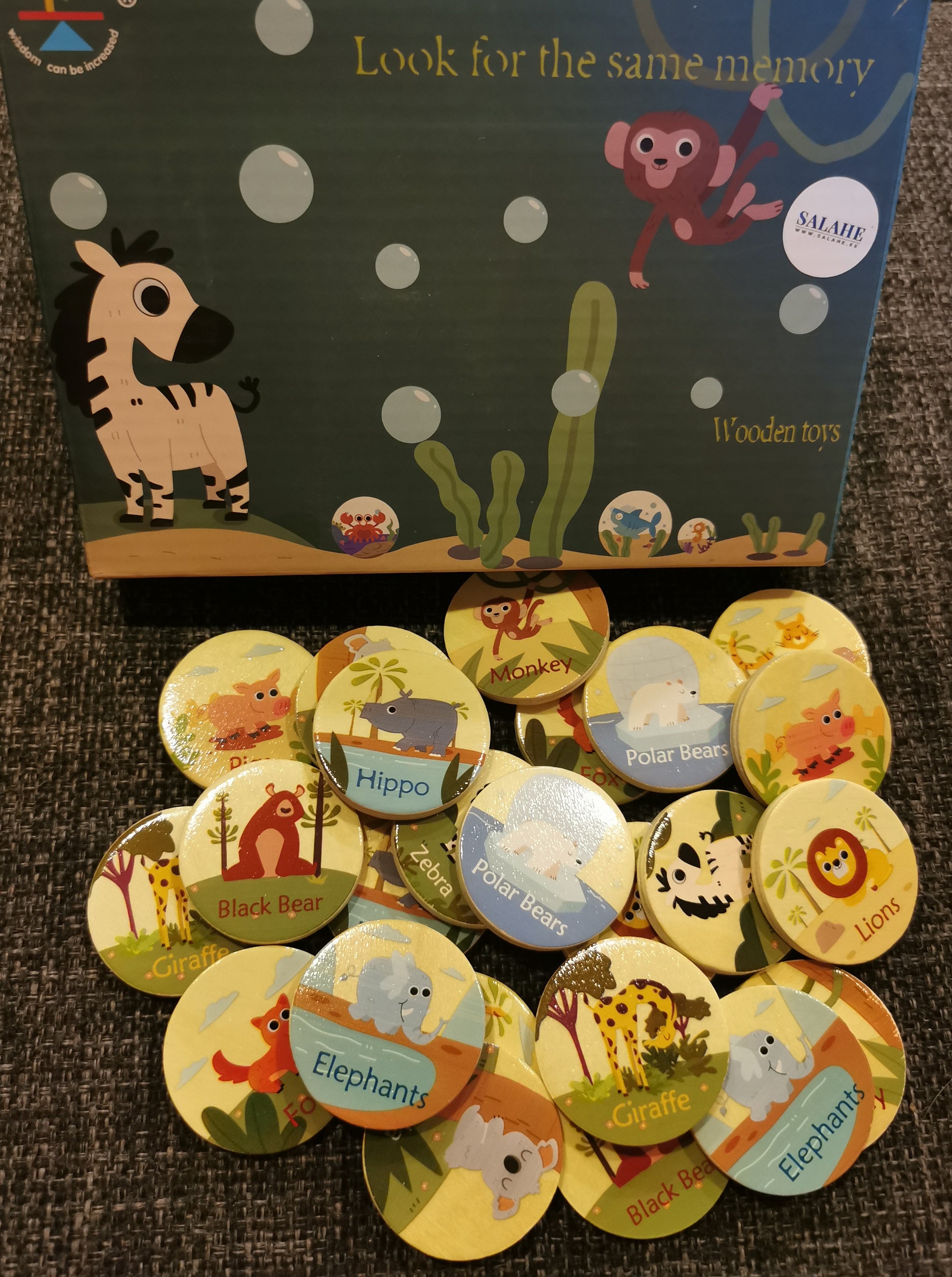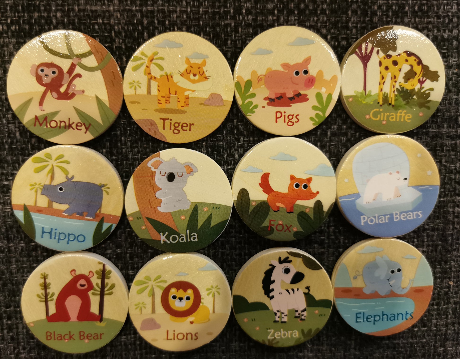 Komplektis on 12 puidust pildipaari (24 kaarti), läbimõõduga 4 cm.