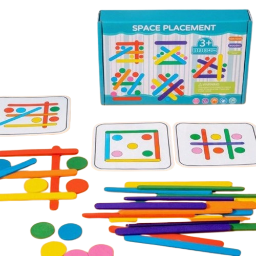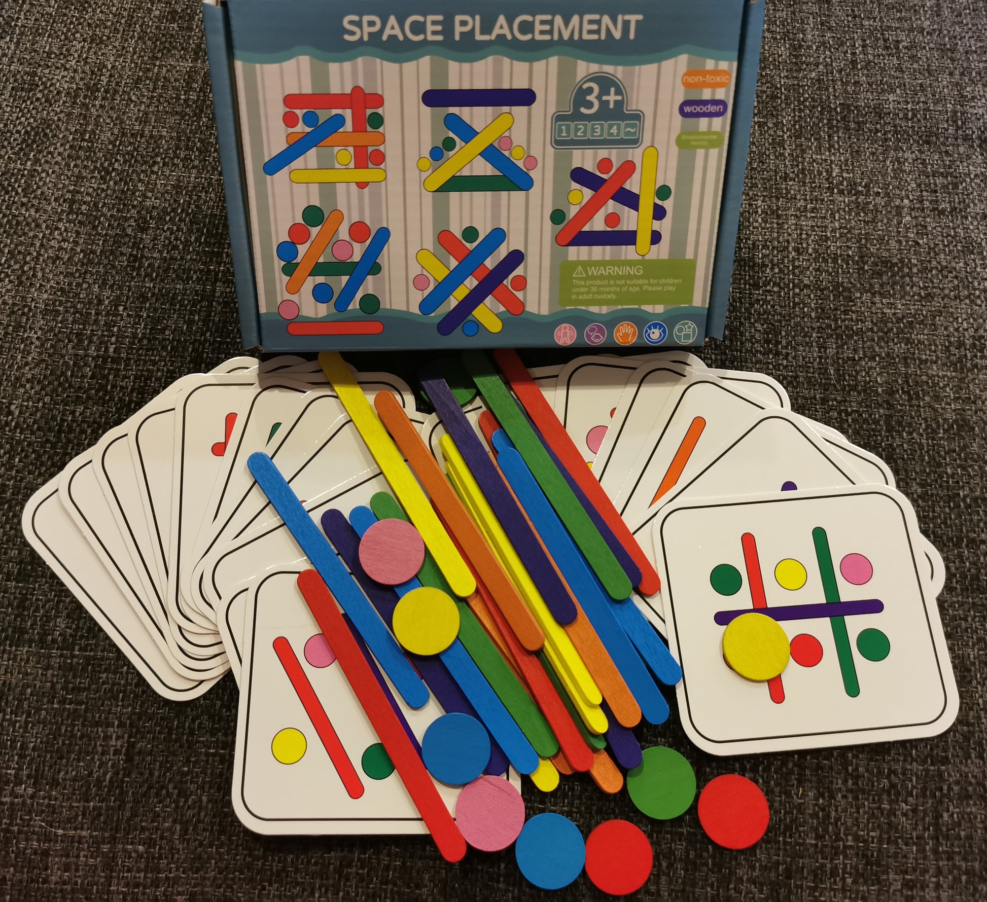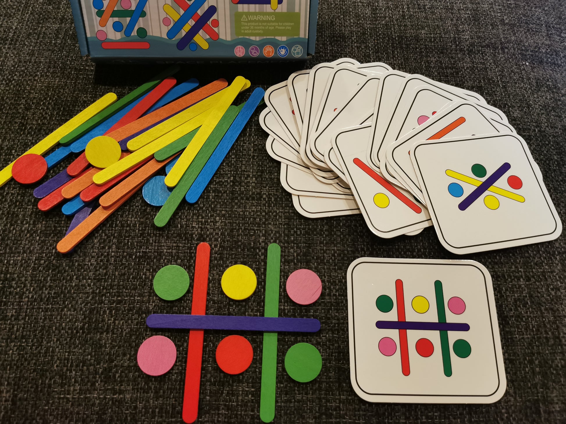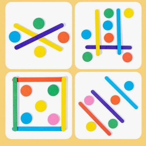 Komplektis 18 kaardikest erinevate ülesannetega ja nende lahendamiseks vajalikud puidust pulgad ja ringid.