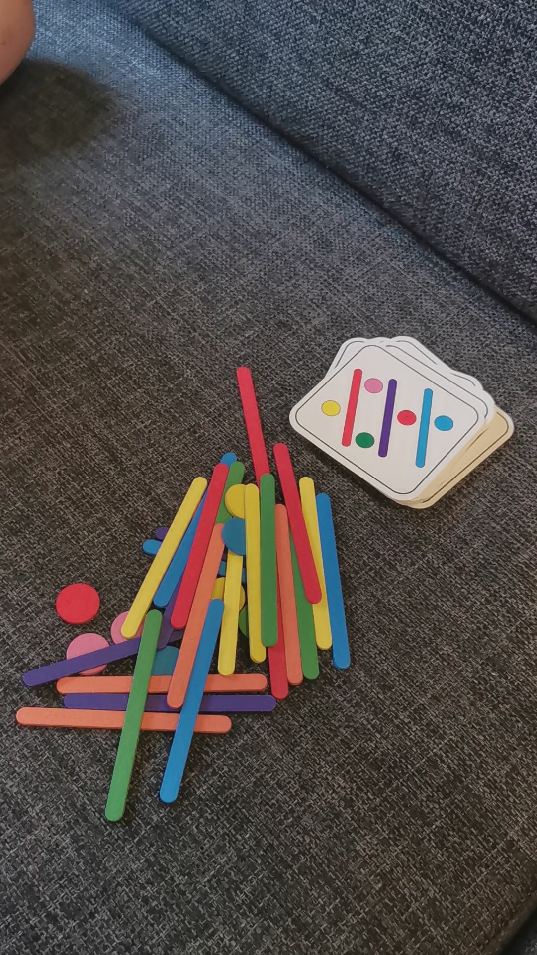 Komplektis 18 kaardikest erinevate ülesannetega ja nende lahendamiseks vajalikud puidust pulgad ja ringid.